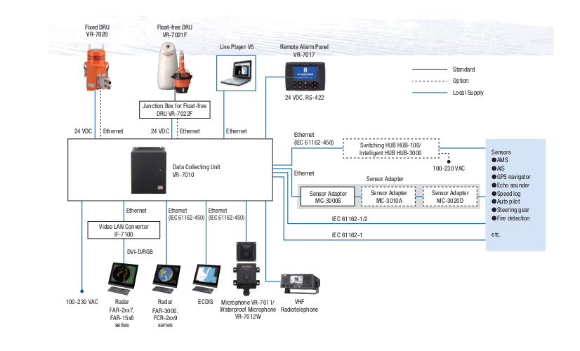 El VR7000 Voyage Data Recorded (VDR) compatible con la IMO es similar a las cajas negras que se llevan en los aviones. El VR7000 documenta todos los datos cruciales a bordo, lo que ayuda a los investigadores a obtener pruebas mediante la revisión de procedimientos e instrucciones en los momentos previos a un accidente. El VR7000 recopila datos de todos los sensores interconectados en la embarcación y los almacena en una Unidad de Registro de Datos (DRU) externa. El sistema viene con dos unidades DRU a prueba de manipulaciones, una fija y otra libre de flotadores. Están diseñados para resistir impactos, presiones, golpes y calor extremos que pueden ocurrir durante un incidente. Cuando se recupera la DRU, las autoridades pueden reproducir los datos almacenados para investigar la causa del accidente. El VR7000 también es una valiosa herramienta de capacitación, que proporciona comentarios sobre los factores que pueden haber contribuido a los incidentes a bordo.